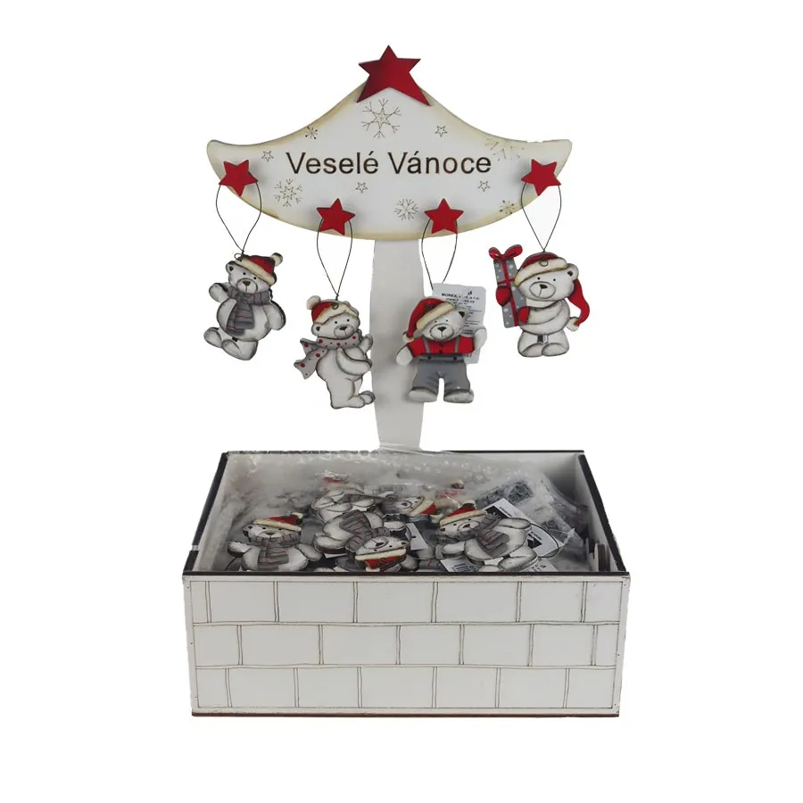 Dřevěné ozdoby na stromeček v boxu. Box obsahuje 72 medvídků, 4 druhy medvídků.