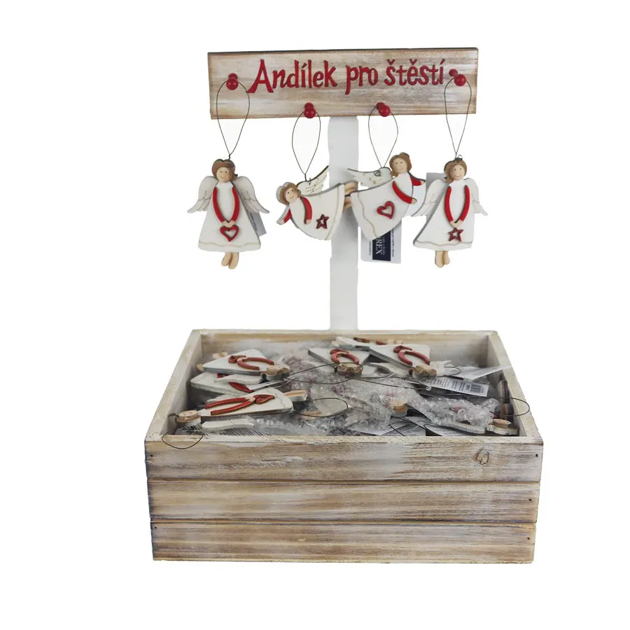 Dřevění andělé na stromeček v boxu. Box obsahuje 72 andílku, 4 druhy andílků.