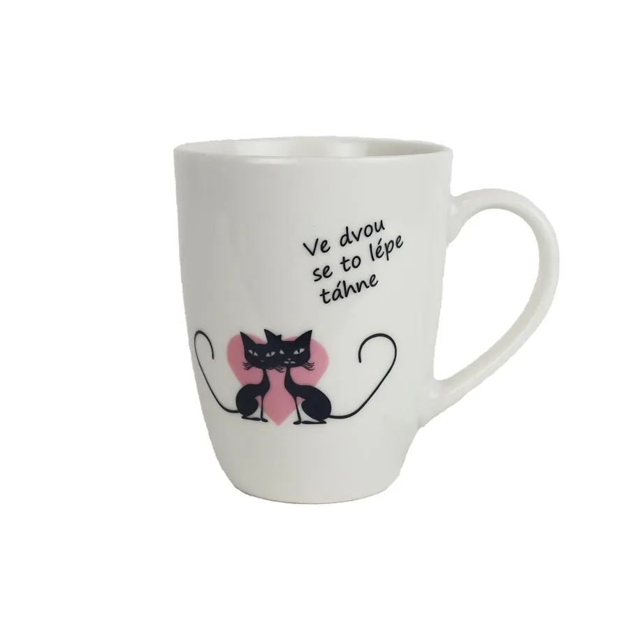 Hrnek kočky s nápisem Ve dvou se to lépe táhne.