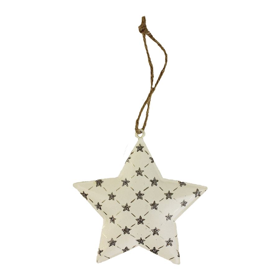 Dekorativní hvězda k zavěšení. Rozměry : 9,5 x 1,2 cm, výška 10 cm. Barva : bílá se stříbrnými hvězdičkami. Materiál : kov.