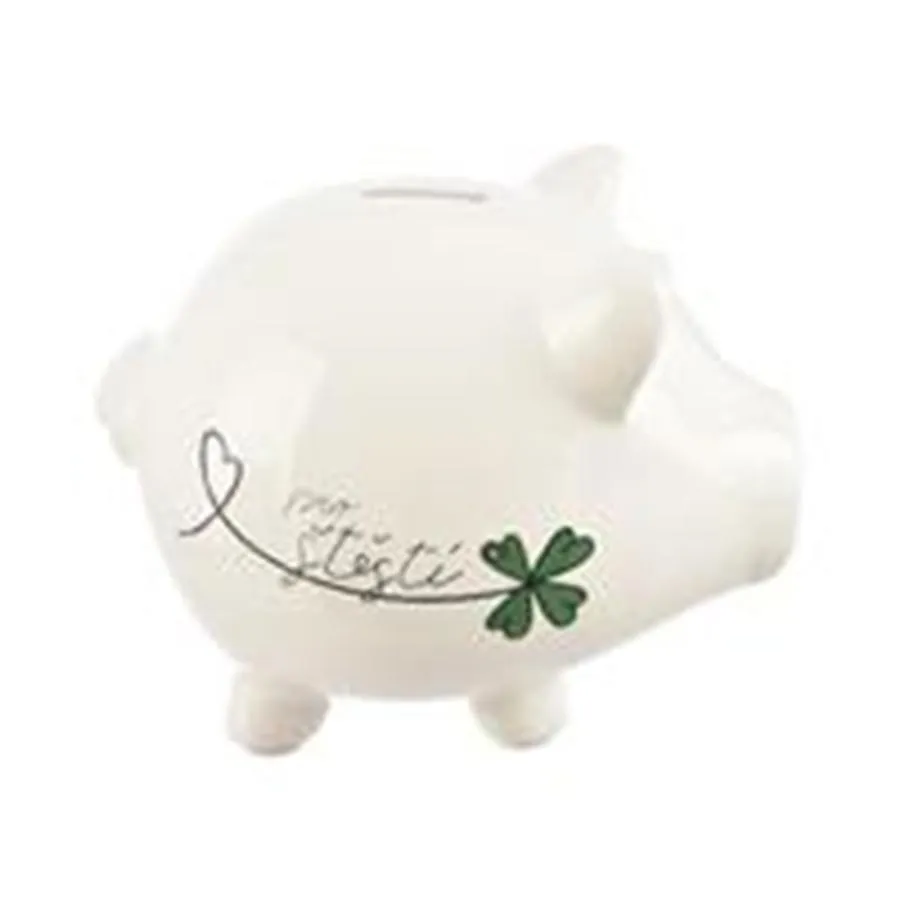 Bílá keramická pokladnička ve tvaru prasátka s nápisem „Pro štěstí“.