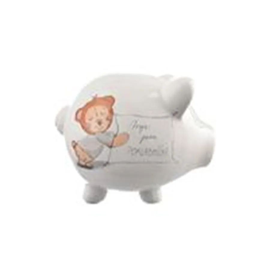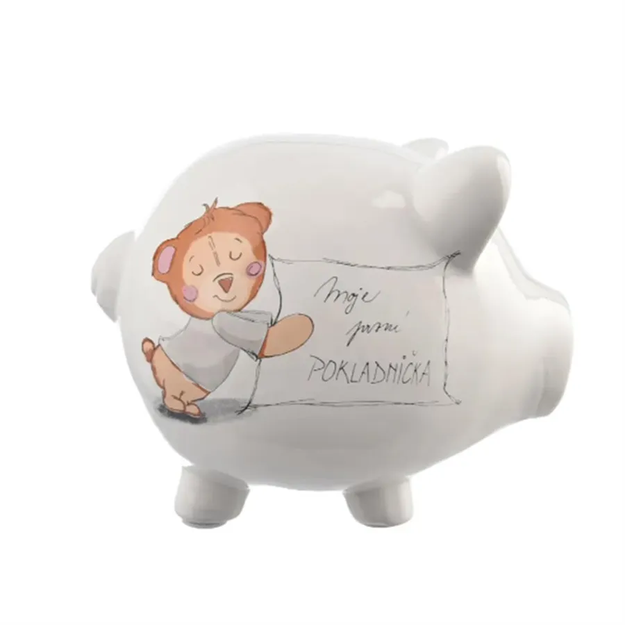 Bílá keramická pokladnička ve tvaru prasátka s nápisem „Moje první pokladnička“.