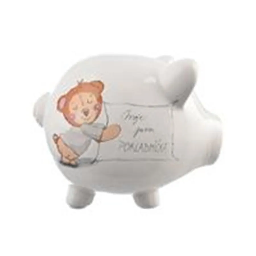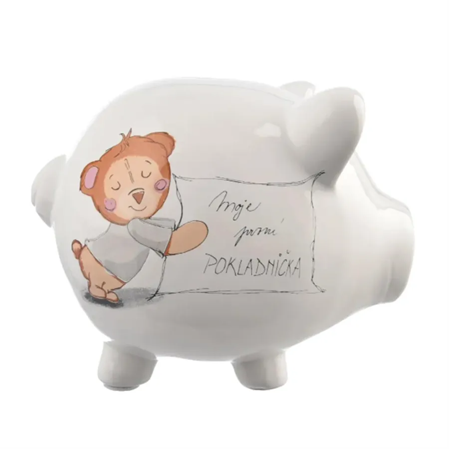 Bílá keramická pokladnička ve tvaru prasátka s nápisem „Moje první pokladnička“.