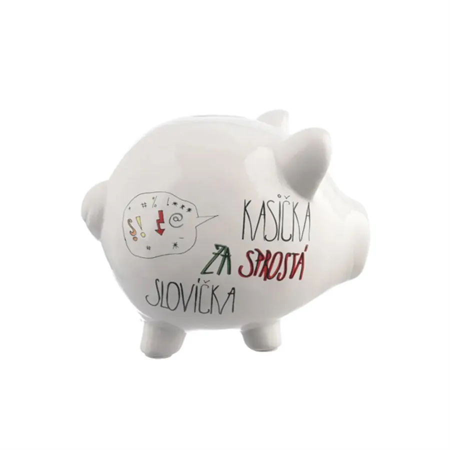 Bílá keramická pokladnička ve tvaru prasátka s nápisem „Kasička za sprostá slovíčka“.