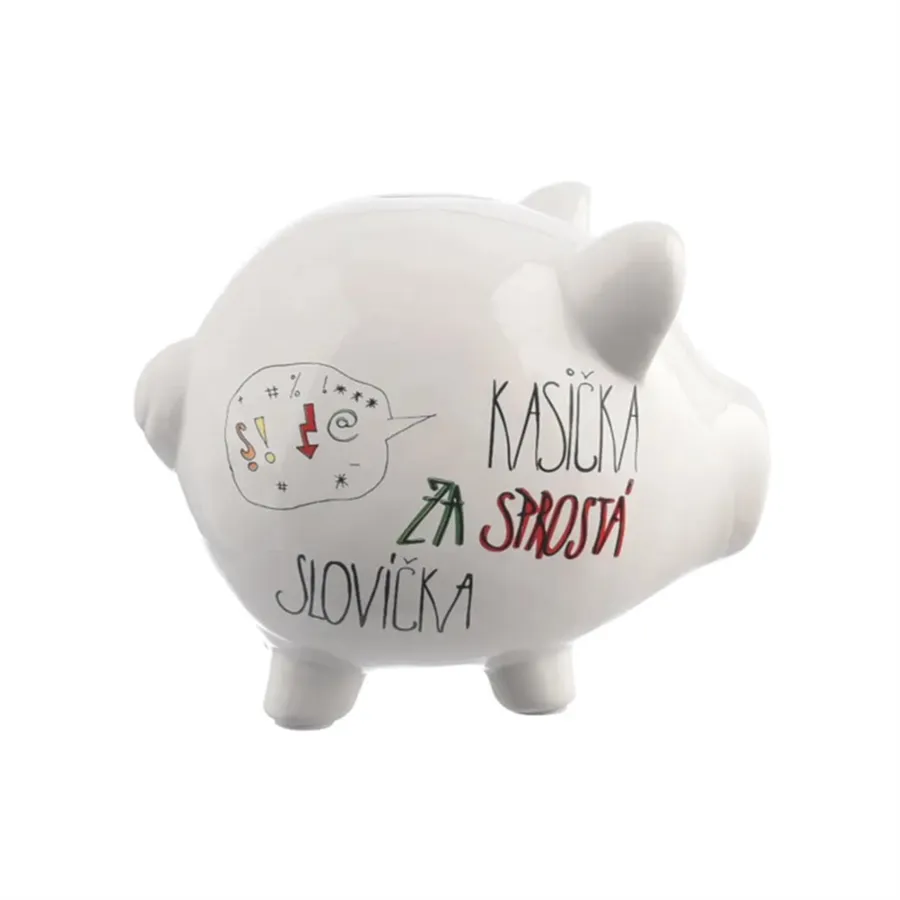Bílá keramická pokladnička ve tvaru prasátka s nápisem „Kasička za sprostá slovíčka“.