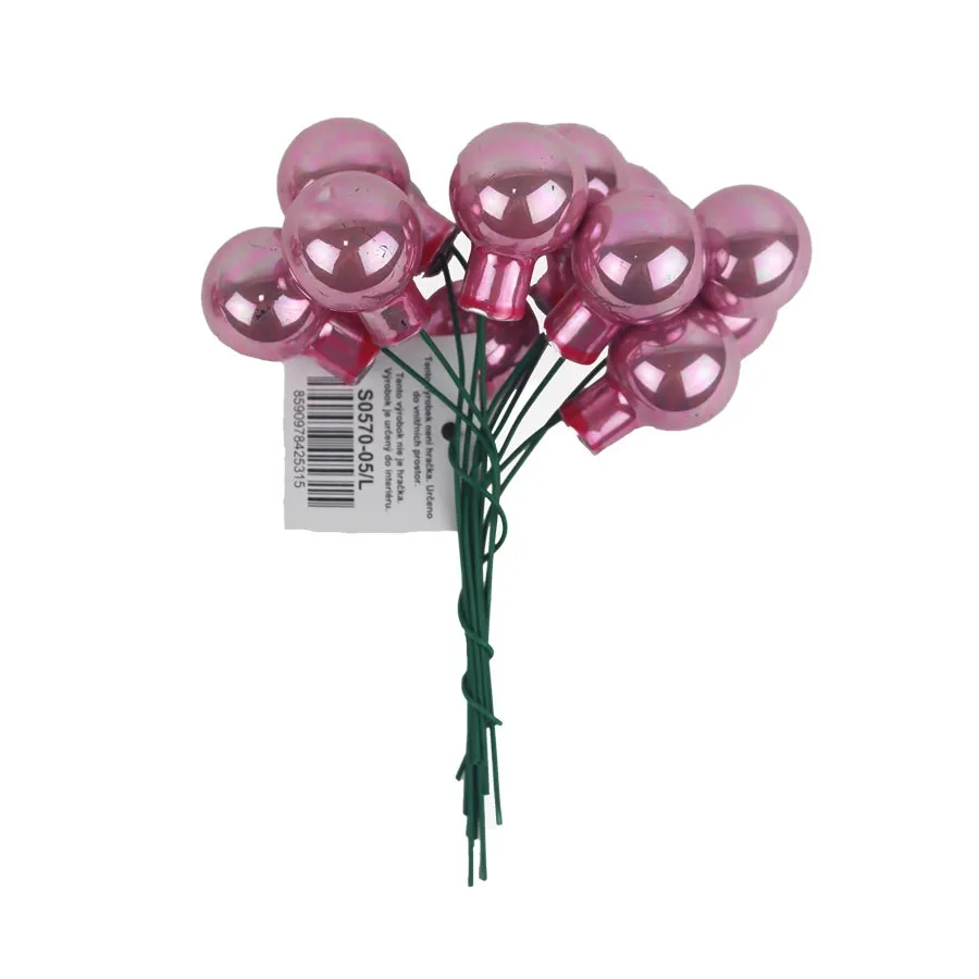 Skleněné baňky na drátku, růžová lesklá, pr. 2 cm, 12 ks, S0570-05/L