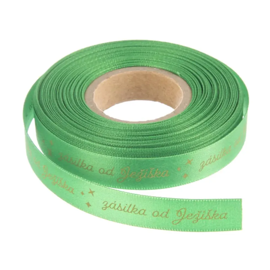 Zelená polyesterová stuha s potiskem "zásilka od Ježíška" je ideální na balení vánočních dárků nebo ozdobení vánočních dekorací.