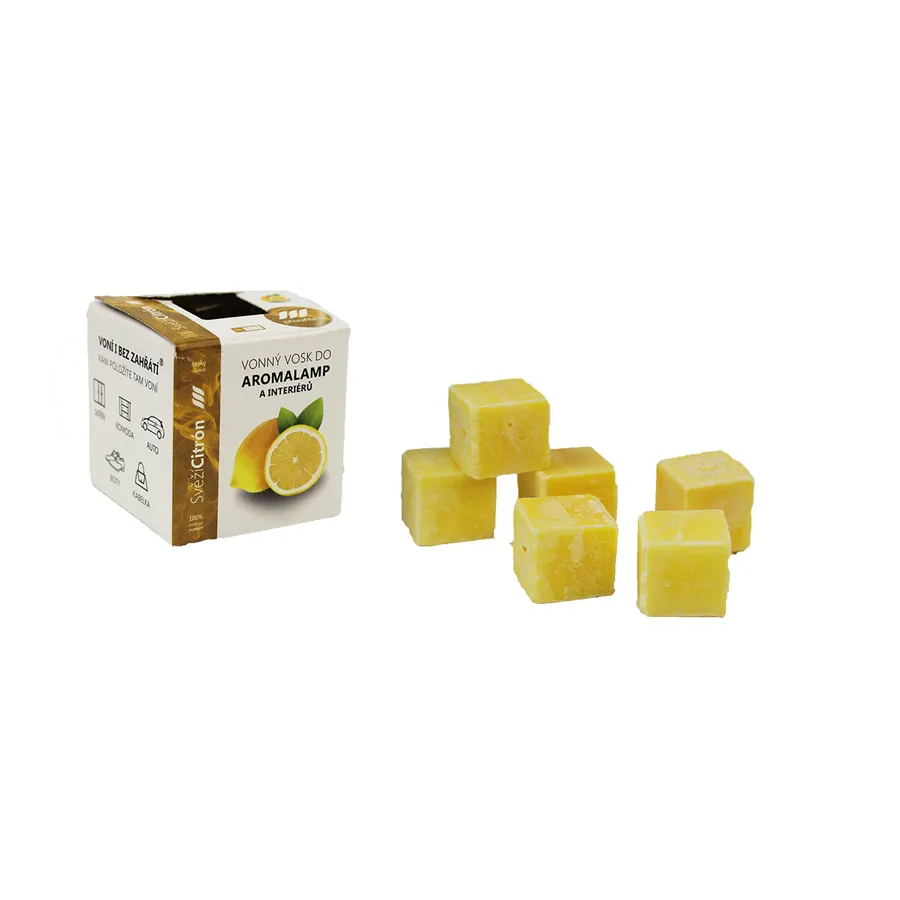 Vonný vosk - SVĚŽÍ CITRON G. Krabička má rozměry 4 x 4 x 4 cm. Krabička obsahuje 8 kostek vosku o velikosti 1,5 x 1,5 x 1,5 cm. Vosk můžete použít do elektrických aromalamp i do aromalamp na čajovou svíčku. Také můžete vosk použít v interiéru - kam vosk položíte, tam voní.